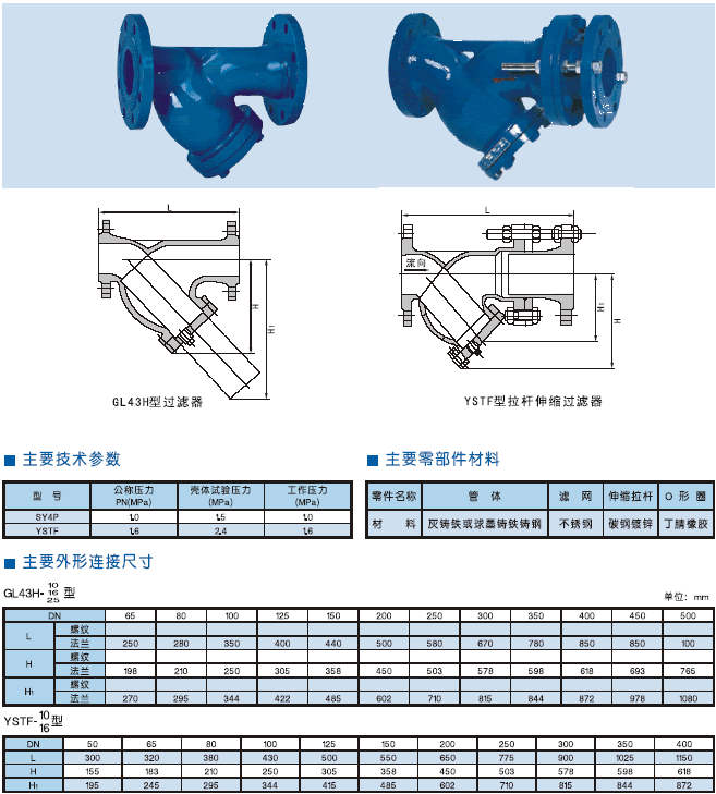 Y型过滤器、Y型伸缩过滤器是使用水力控制阀及精密的易堵塞的机械产品所必须具有的过滤设备。通常安装在水力控制阀等设备的进口端,防止颗粒性杂质进入通道,造成阻塞,使阀门或其他设备失灵而不能正常使用。Y型过滤器结构简单、流阻小,可在线排除污物而不需拆除。Y型拉杆伸缩过滤器还具有安装长度可调,装拆方便的特点。可根据需要设置滤网数目,通常范围:水18-30目、蒸汽40-100目、油100-180目。